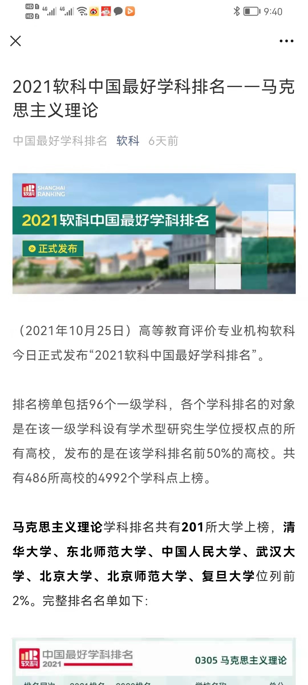 据悉,2021软科中国最好科学排名榜单包括96个一级学科,各个学科排名的对象是在该一级学科设有学术型研究生学位授权点的所有高校,发布的是在该学科排名前50%的高校。软科中国最好学科排名的指标体系包括人才培养、科研项目、成果获奖、学术论文、学术人才五个指标类别,下设17个指标维度,共计50余项反映学科竞争力的客观量化指标,涉及百余项观测变量。由于部分指标在不同学科门类的适用性和重要性存在差别,因此中国最好学科排名在不同学科采用差异化的指标体系。今年马克思主义理论学科全国共有201所高校上榜。