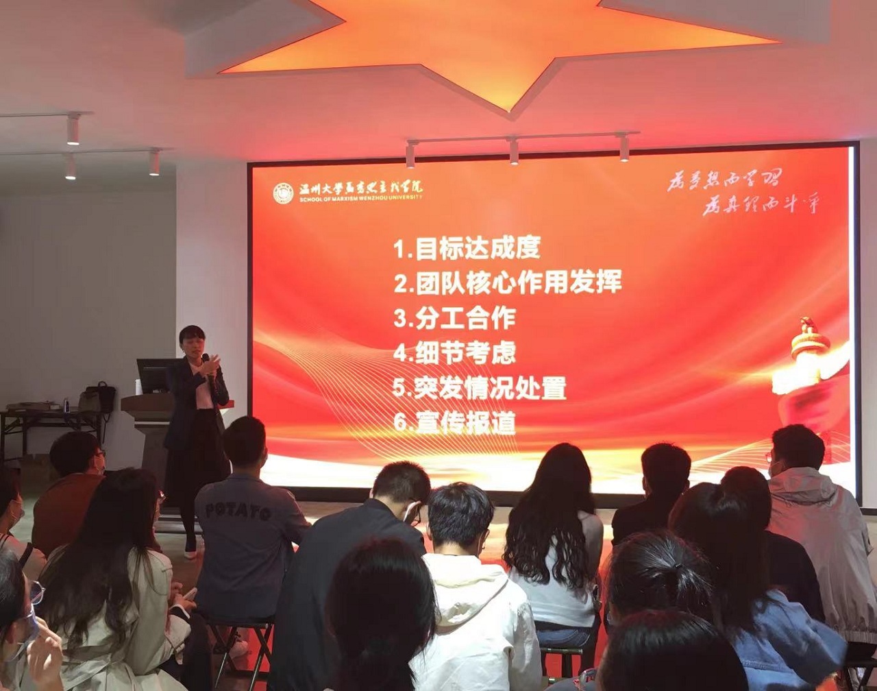 会上,叶柏霜老师就学生干部如何策划活动提出了三点要求:一是精心谋划,通盘考虑。举办活动的首要前提是确立活动要达成的目标,即把目标达成度放在首位。同时,学生干部们要学会着眼于团队核心作用;进行科学有效地分工,着力处理好细节;提高应对突发情况的能力;强化校园网、微信公众号等平台的宣传报道功能。二是精准实施,有效执行。叶老师认为,作为学生干部在举办大型活动时要保持责任感和忠诚度,注重场地、时间等信息的动态变化、及时传达与精准对接,做到眼观六路,耳听八方。三是精细总结,反观成效。她赠予同学们三句话:每一次的瑕疵,都是为了遇见下一次的完美;脚步走不到,目光要达到,目光达不到,梦想要达到;星光不负赶路人,带着情怀去总结。