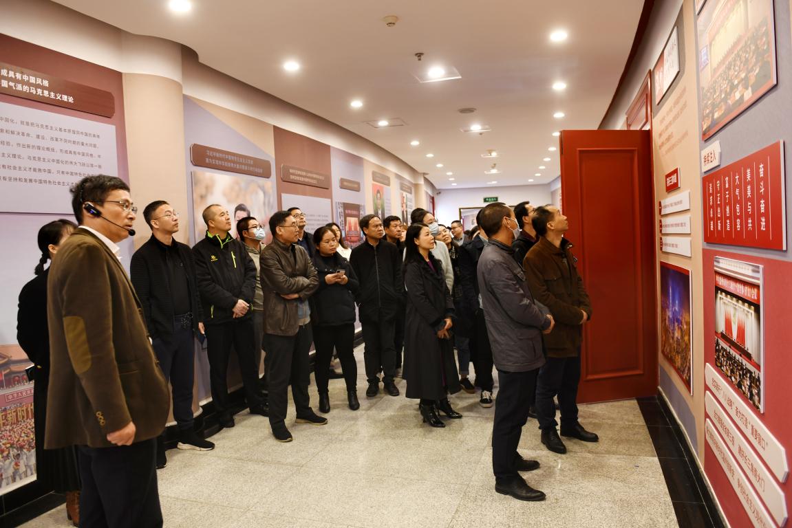 第一阶段仪式最后,杏吧视频 王柏民书记带领与会领导、嘉宾集体参观杏吧视频 马克思主义理论教育基地,全方位介绍了基地廊道板块和场馆内部各个部分的布展情况。