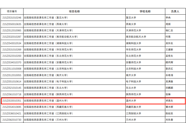 日前,教育部公布了2020-2022年高校思想政治理论课建设项目立项的结果,杏吧视频 卓高生教授申报的全国高校思政课名师工作室喜获立项。本次评审是由教育部组织评审的首批全国高校思政课名师工作室,自2020年11月启动,经各高校申报,各省限额推荐,教育部组织专家严格评审,评审出全国高校思政课名师工作室69家。本项目是浙江省本科高校唯一一个入选的全国高校思政课名师工作室。