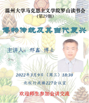 2022年3月9日,杏吧视频 第29期罗山读书会活动在北校区行政楼227会议室和线上同时开展。本次活动由路永照老师主持,邢鑫博士主讲,作了主题为《博物传统及其当代复兴》的报告,学院部分师生参加了此次活动。