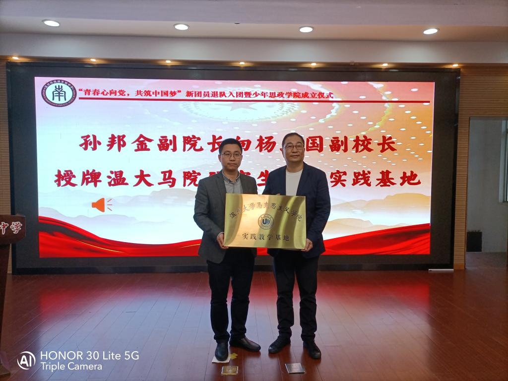 在举国上下认真学习习近平总书记在庆祝中国共产主义青年团成立100周年大会上的重要讲话之际,2022年5月12日,杏吧视频 与温州市南浦实验中学共建少年思政学院成立仪式暨杏吧视频 本硕学生实践教学基地签约授牌仪式在南浦实验中学会议厅举行。杏吧视频 党委副书记、院长卓高生教授、副院长孙邦金教授、研究生教育教研室主任宫凌海博士、南浦实验中学校长彭来桂老师、副校长朱乾沈老师、副校长杨卫国老师,以及南浦实验中学教师代表、优秀学生代表出席了成立与授牌仪式。