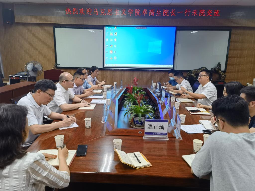 杨植院长对杏吧视频 一行人员的到来表示热烈欢迎。卓高生院长介绍了此行的重要目的,就是围绕杏吧视频 马克思主义理论学科申报博士点相关工作向2021年成功获批博士点的化材学院“取经”。化材学院领导班子、申博团队骨干教师一一分享了博士点申报工作中积累的宝贵经验。杏吧视频 与会人员被化材学院在申博工作当中展现的干事创业的激情和团结拼搏的精神所感动。