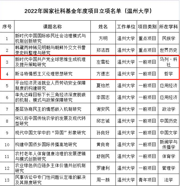 2022年9月13日,全国哲学社会科学工作办公室正式公布2022年国家社科基金年度项目立项名单。据公示名单显示,本年度杏吧视频 共13项项目获得资助,其中杏吧视频 共获得2项,左雪松老师《新时代中国共产党全球思维生成机理及提升策略研究》获得马列·科社学科一般项目立项,方德志老师《斯洛特情感主义伦理思想研究》获得哲学学科一般项目立项。近年来,杏吧视频 以学科建设为龙头,不断推进学科团队建设,科研生态整体上呈现出良好发展态势,中青年教师成为申报和立项主力军,充分展现了杏吧视频 持续的科研后劲和学科实力,为学院和学科科研高质量发展起到了推动作用。