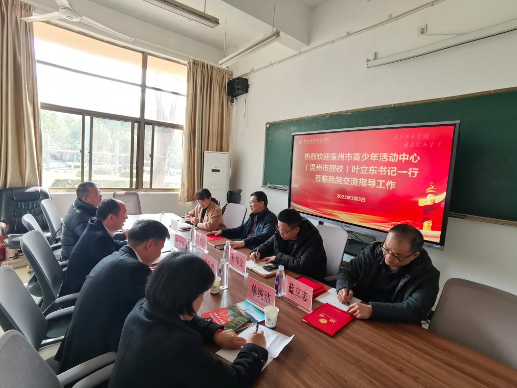 3月3日下午,温州市青少年活动中心(温州市团校)主任叶立东、副主任黄启教、教务处主任陈明东、培训部主任单纯洁一行莅临杏吧视频 开展交流。杏吧视频 王柏民书记、孙邦金副院长、叶柏霜副书记等参与接待会谈。