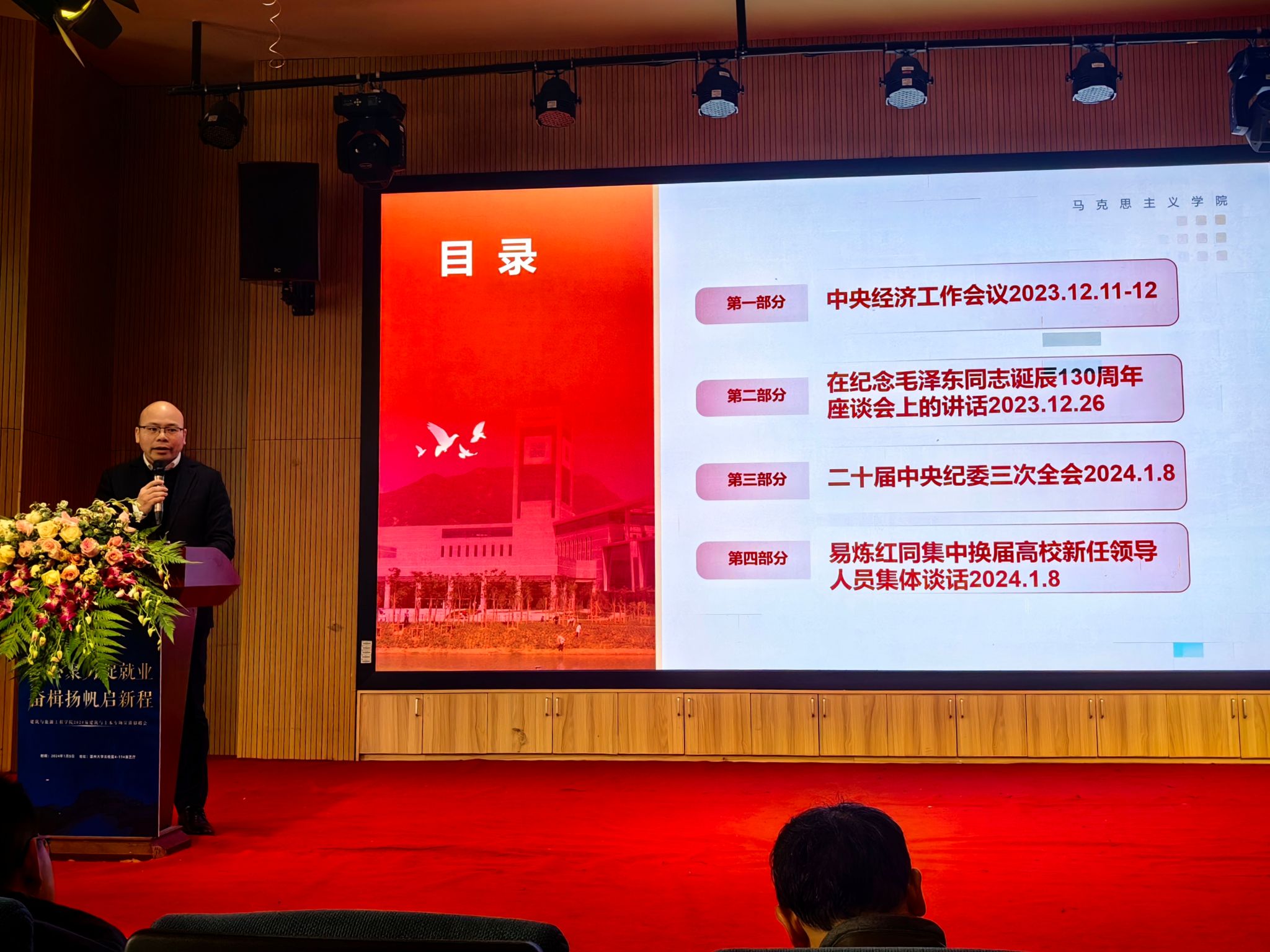 在政治理论学习环节,卓高生院长领学。他深入讲解了以下四个重要内容:中央经济工作会议精神、习近平总书记在纪念毛泽东同志诞辰130周年座谈会上的重要讲话精神、二十届中央纪委三次全会精神、省委书记易炼红同集中换届高校新任领导人员集体谈话精神。通过以上四个内容的学习,学院全体教职工进一步统一了思想、凝聚了共识。大家纷纷表示,要将这些政治理论转化为实际行动和工作动力,为学院的发展贡献自己的力量。