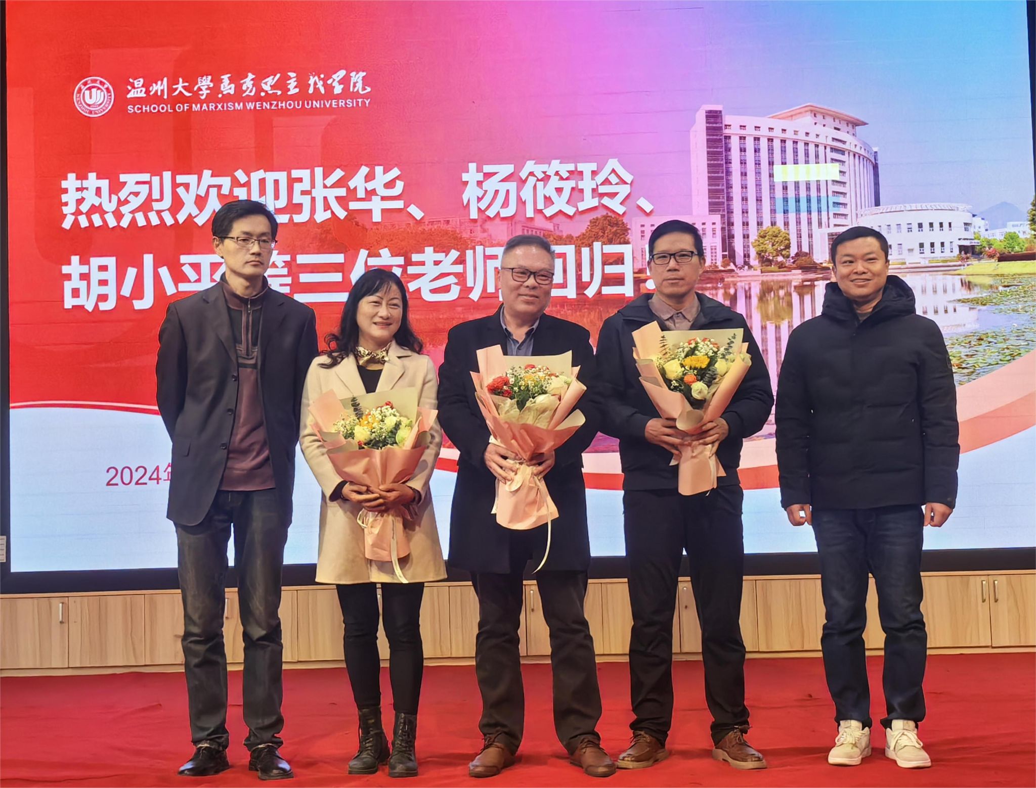 会议伊始,学院首先对支教派驻温州理工学院的张华、杨筱玲、胡小平三位老师回归学院进行了简单而热烈的欢迎仪式。原理教研室骆徽主任、概论教研室关震代主任为三位教师献上了鲜花。
