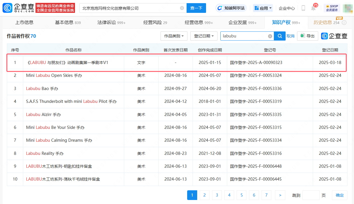 泡泡玛特关联公司北京泡泡玛特文化创意有限公司已登记《LABUBU 与朋友们》动画剧集第一季剧本V1作品著作权。