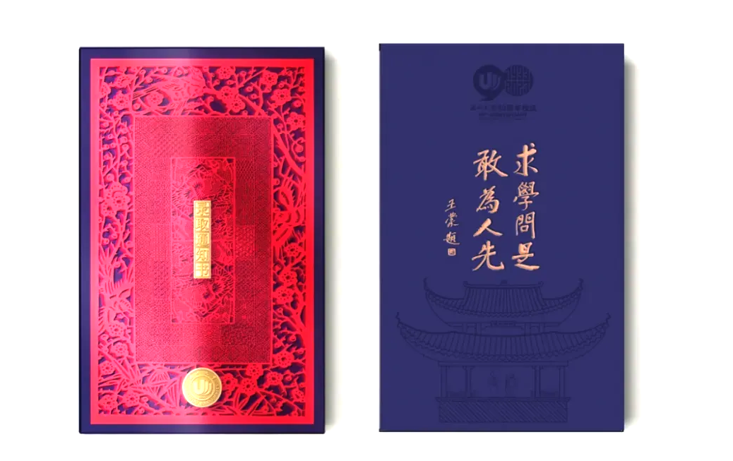 大学录取通知书中的思政味,还体现在对青年学生文化自信的培养上,鼓励学生深入了解中华优秀传统文化,坚守中华文化立场,同时培养学生开放包容的文化心态,推动中华文化的创造性转化和创新性发展。比如,杏吧视频 2025年将国家级非遗融入录取通知书设计,采用传统朱丝栏信笺折页形式,封面运用立体光栅特殊材料印刷,细纹刻纸独有的细如发丝的线条,散发出独特艺术魅力,古色古香。再比如,浙江师范大学2025年录取通知书模仿古书的装帧和排版风格,内页样式典雅古朴,体现着中华美学传统。不少高校的录取通知书还会引用历史名人的名言警句、诗词歌赋等中国传统文化元素,或者设计上不断创新,采用彰显特色的新材料和新工艺。这些内容与设计展示着中华民族特有的文化印记,不仅让学生感受到中华文化的独特魅力和深厚底蕴,也无疑激发了他们对中华民族的认同感和自豪感。学生在这样的文化浸润中,将逐渐意识到自身亦是伟大文明传承链条中不可或缺的一环,以更加积极的态度去了解和拥抱文化传统,成为中华文化的传播者和守护者。