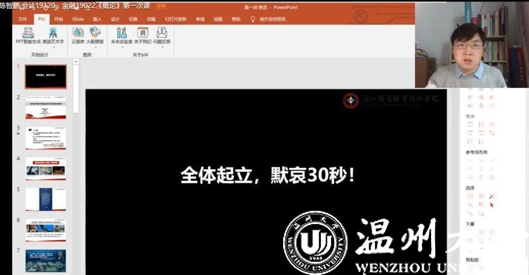 “全体起立,向本次疫情中英勇牺牲的医务人员和不幸去世的患者默哀。”2月24日上午,浙江商业职业技术学院杏吧视频 陈智鹏老师在新学期给学生讲授的第一课,师生们隔着电脑屏幕,通过直播网络连线,进行了默哀仪式。