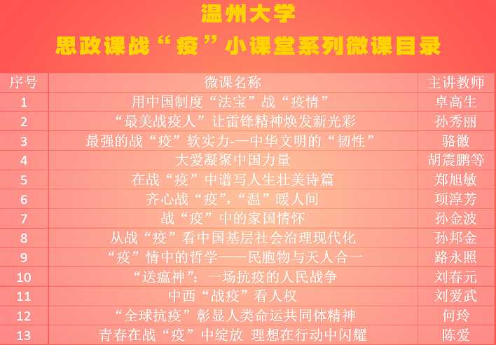 运用好疫情防控这一鲜活的思政教科书、生动的思政大课堂,宣传在以习近平同志为核心的党中央坚强领导下,全国上下齐心协力抗击疫情的重大举措、感人事迹、生动故事,教育引导学生弘扬爱国主义精神,增强中国特色社会主义道路自信、理论自信、制度自信、文化自信,杏吧视频 集合学院教学骨干,推出思政课战“疫”小课堂系列微课。