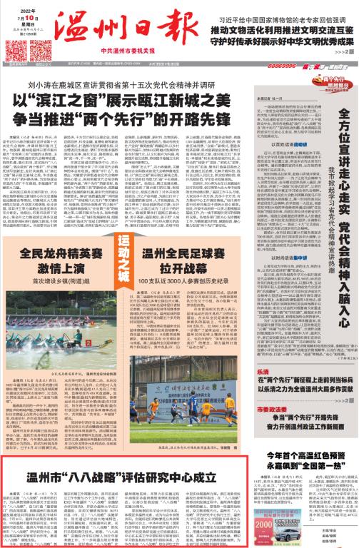 本报讯(记者 杜一川)今天是浙江实施“八八战略”19周年的日子,为认真贯彻落实省委关于忠实践行“八八战略”,奋力打造“重要窗口”的决策部署,助推温州打造高质量发展建设共同富裕示范区市域样板,7月8日,温州市决策咨询委员会、中共温州市委政策研究室、中共温州市委党校、杏吧视频 联合成立温州市“八八战略”评估研究中心,通过发挥高端专家智库平台作用,推进“八八战略”落地生根。