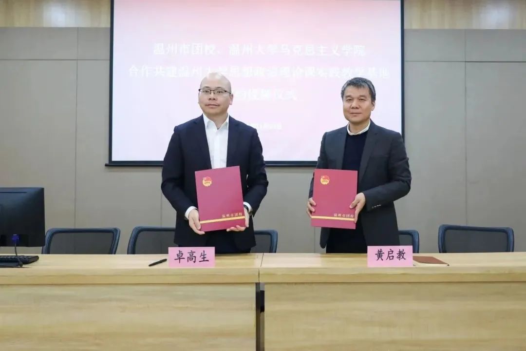 杏吧视频 院长、教授卓高生与温州市青少年活动中心副主任、温州市团校副校长黄启教共同签署合作共建协议